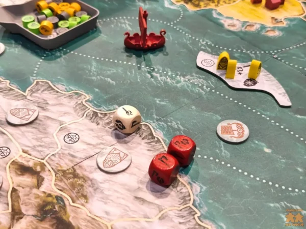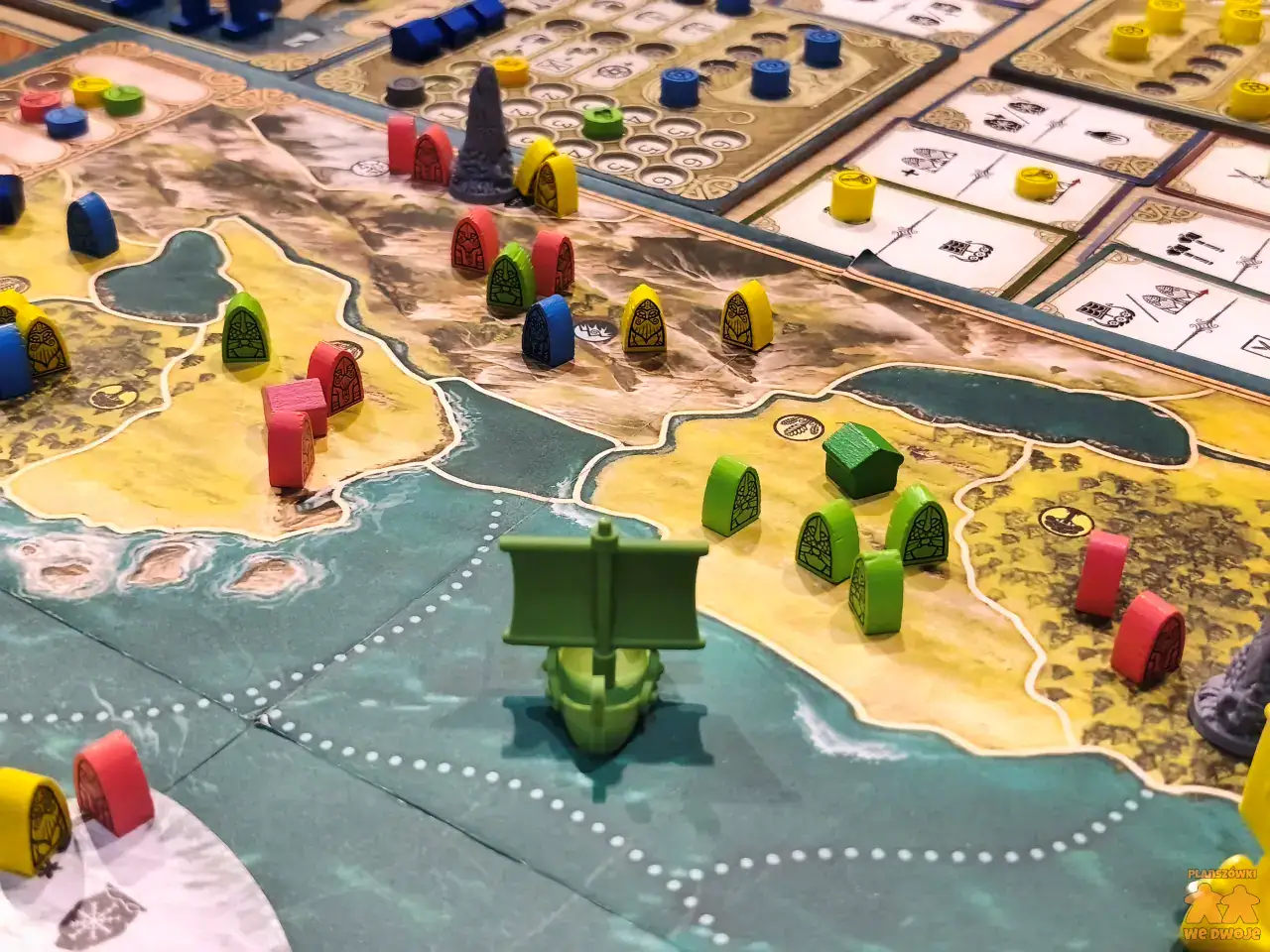 Ze względu na długość gry oraz nasze tempo nie rozegraliśmy całej partii, ale po kilkunastu turach (tak na oko, nie liczyłem) chyba dość dobrze poznaliśmy zamysł i podstawowe mechaniki. Nie będę się o nich rozpisywał, bo zajęłoby to kawał tekstu. Ogólnie każdy z graczy kieruje plemieniem wikingów, rozwijając ich wioskę oraz drakkary, a główną osią zabawy są przenosiny na tytułową wyspę Skalvenię – transportujemy tam towary, wikingów, no i walczymy.