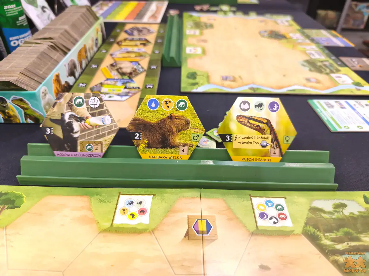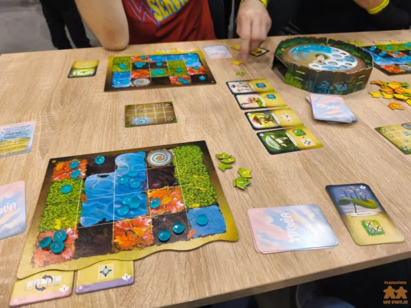 W niedzielę z samego rana zjawiliśmy się przy stoisku Portalu, żeby zagrać w Rezerwat. Zapał nagle opadł, gdy okazało się, że gra rozłożona jest przy obu stolikach na trzech graczy, a byliśmy na ALEgramy we czworo… Na szczęście przy stoliku obok było wolne miejsce, więc nie czekając dołączyłem do rozgrywki. Znajac Ark Novę, w której jednak nie przekonał mnie system punktacji, dość szybko odnalazłem się w zasadach Rezerwatu. Tytuły mają zbliżony przebieg oraz odczucia z zabawy, więc Rezerwat stanowi właściwie wersję light większej planszówki.