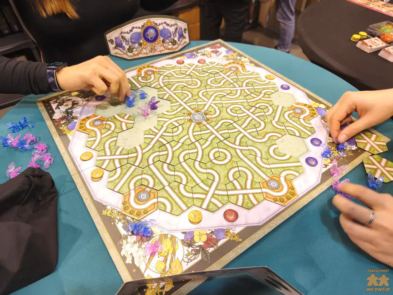 Po drugiej stronie stoiska z puzzlami nasz wzrok przyciągnęła prosta, ale schludna plansza z półprzezroczystymi motylkami. Okazało się, że są to Ulotne Motyle autorstwa Reinera Knizii. Zagraliśmy, spodobało się i do domu wracaliśmy już z egzemplarzem do recenzji. W grze układa się ścieżki, po których poruszają się tytułowe motyle, a zadaniem graczy jest doprowadzenie ich do krawędzi oznaczonych naszymi znacznikami. Bardzo proste, dynamiczne i przyjemne po pierwszej partyjce.