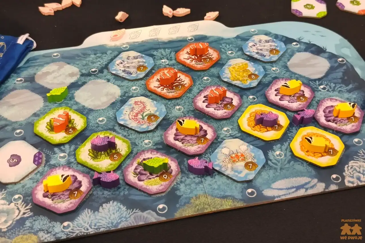 Shallow Sea ma dość proste zasady, chociaż podczas partyjki zajrzeliśmy kilka razy do instrukcji. Nic też w tym dziwnego, bo robiliśmy to głównie po to, aby sprawdzić działanie kafelków. W grze dobierając kafelki raf koralowych, zwierząt morskich i znaczniki ryb, uzupełniamy naszą planszę morza, dokładając je tak, aby realizować cele i zdobywać punkty. Pierwsze wrażenie z rozgrywki było bardzo pozotywne. To typ planszówki, którą faktycznie lubimy, a w tytuł moglibyśmy zagrać z grającymi znajomymi (jak na ALEgramy), jak i chyba nawet z moją mamą. Moim skojarzeniem od razy był Reef, gra w podwodnym klimacie, w której też należy dokładać odpowiednio elementy. Shallow Sea jest jednak bardziej złożonym tytułem,w którym niektórzy przy stole łapali nawet chwilę zamuły, żeby jak najlepiej dołożyć elementy. Cieszę się, że zagraliśmy, bo to fajna planszówka!