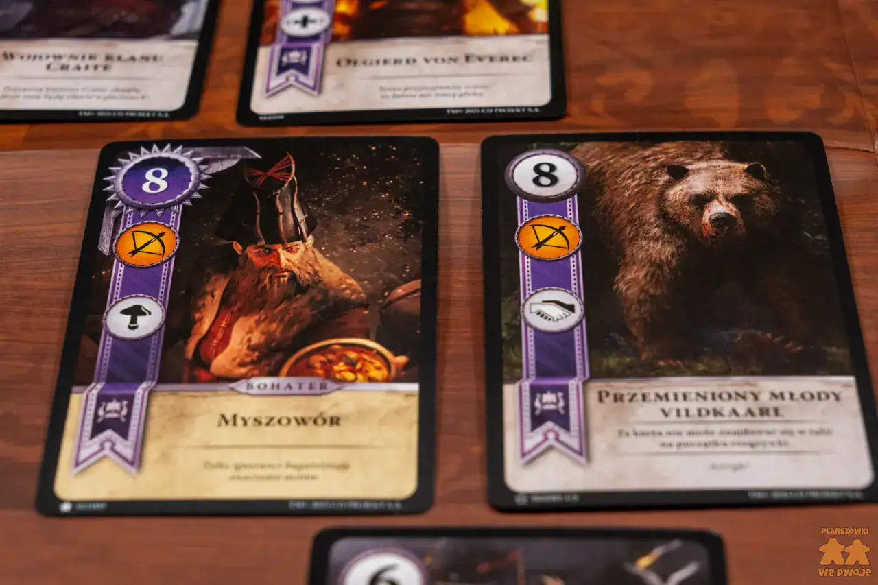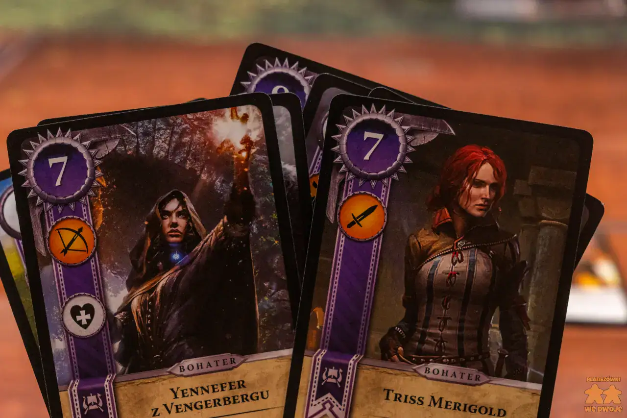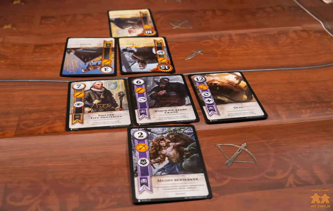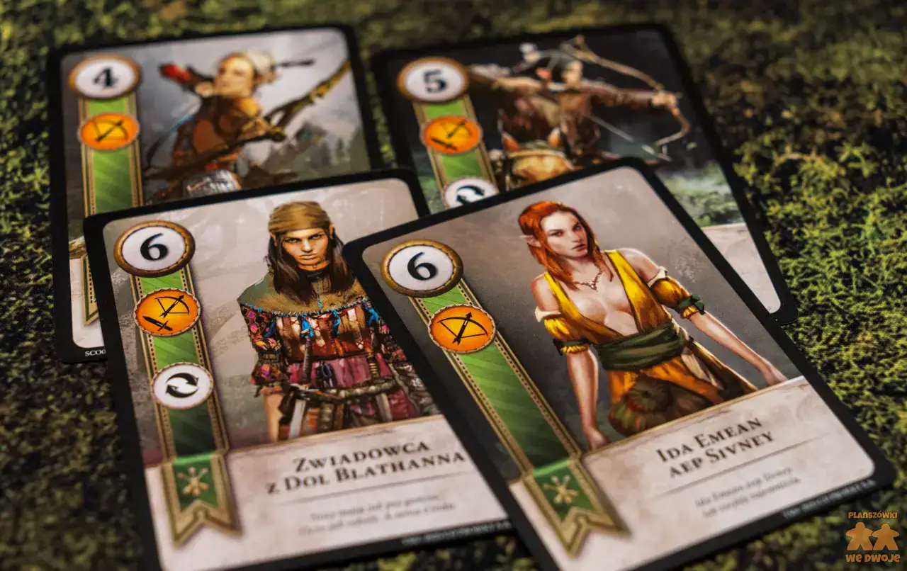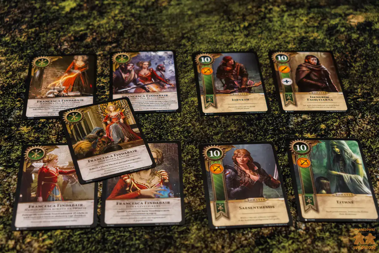 Podoba mi się, że w zestawie dostajemy aż 5 różnych frakcji. Dzięki temu każdy może wybrać kim ma ochotę pokierować. Zwiększa to też regrywalność tytułu. Pakiety kart różnych frakcji, z których tworzymy swoje talie, niestety dość nieznacznie różnią się między sobą. Są w nich karty bardzo słabe, których w ogóle nie ma sensu brać do talii, zaś bohaterowie w większości powtarzają się i praktycznie w każdej partii pojawiają się Geralt i Ciri, bo są najsilniejszymi postaciami.