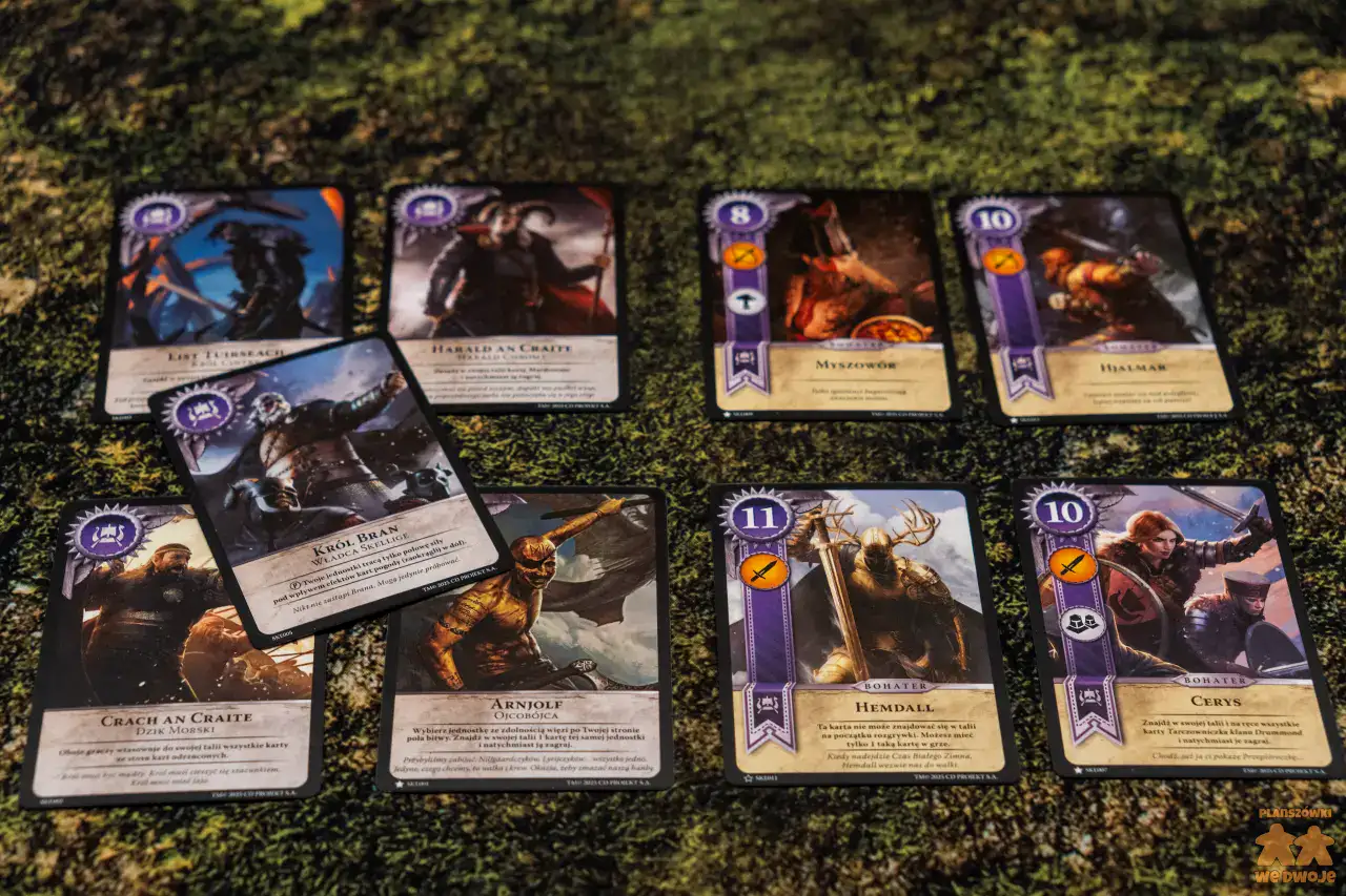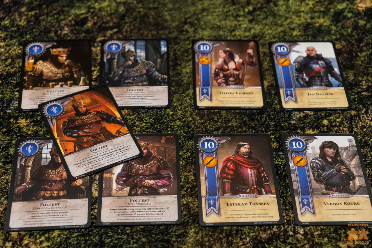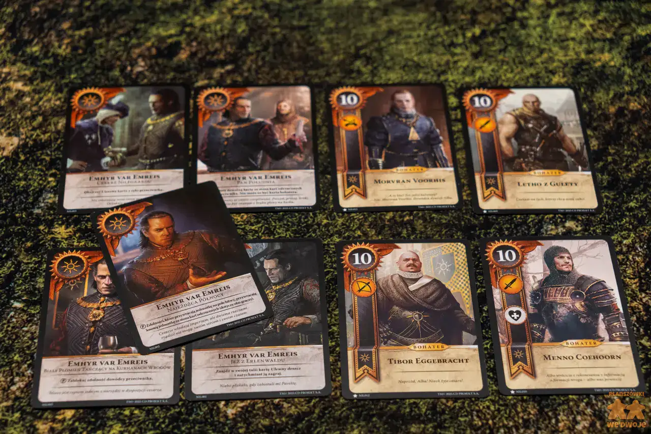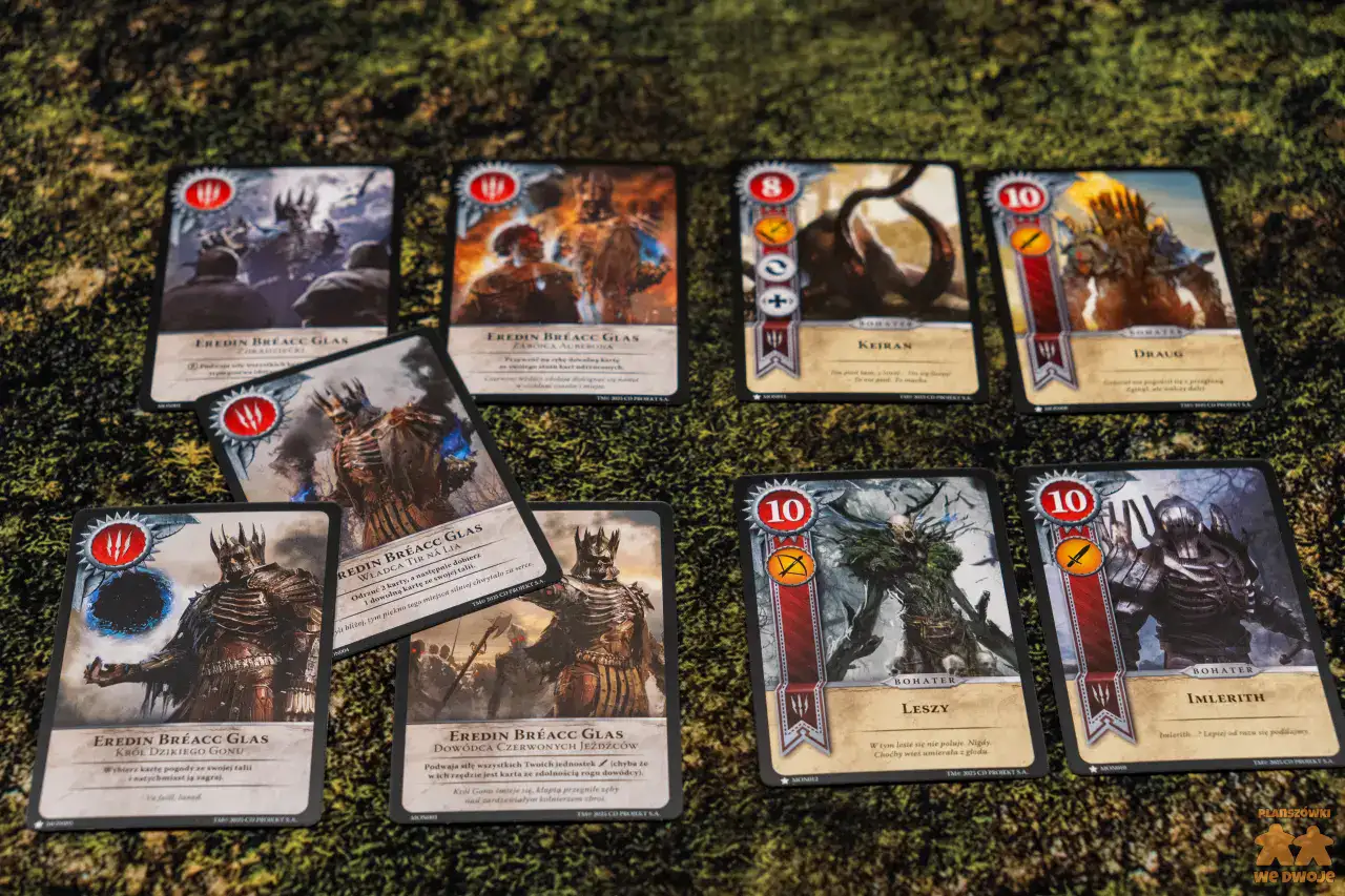 Podoba mi się, że w zestawie dostajemy aż 5 różnych frakcji. Dzięki temu każdy może wybrać kim ma ochotę pokierować. Zwiększa to też regrywalność tytułu. Pakiety kart różnych frakcji, z których tworzymy swoje talie, niestety dość nieznacznie różnią się między sobą. Są w nich karty bardzo słabe, których w ogóle nie ma sensu brać do talii, zaś bohaterowie w większości powtarzają się i praktycznie w każdej partii pojawiają się Geralt i Ciri, bo są najsilniejszymi postaciami.