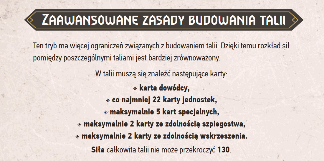 Gwint przewiduje też tryb zaawansowanych zasad budowania talii, które ograniczają bardziej niż standardowe to, z czego może składać się talia. Dzięki nim frakcje stają się bardziej wyrównane, co jest niby sensowną opcją, ale jakoś nie przekonuje mnie ratowanie balansu gry poprzez wprowadzanie dodatkowych reguł…