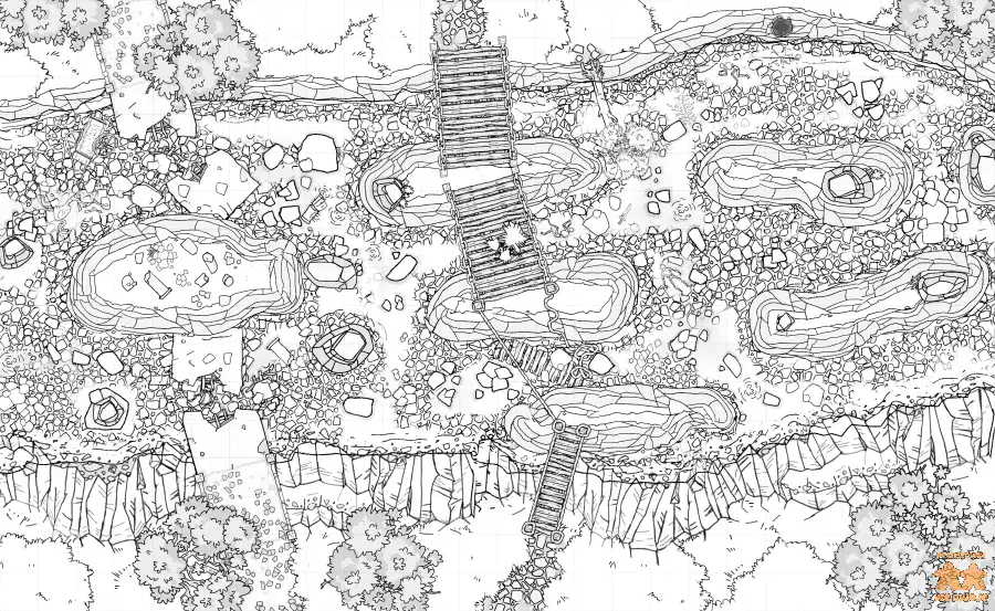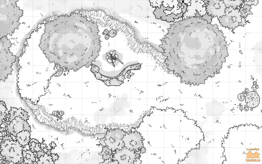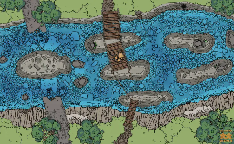 Dawny, kamienny most został uszkodzony dziesiątki lat temu. Po upadku imperium nikomu nie zależało na odbudowywaniu konstrukcji. Z czasem obok dawnego mostu powstała drewniana kładka umożliwiająca podróżnym w miarę bezpieczne przekroczenie rzeki. Jakiś czas temu kładka została jednak zniszczona. Nadal można próbować przeprawić się w tym miejscu, ale co jeśli w okolicy czyhają ci, którzy zniszczyli kładkę? To idealne miejsce na zasadzkę bandytów, orków lub goblinów.